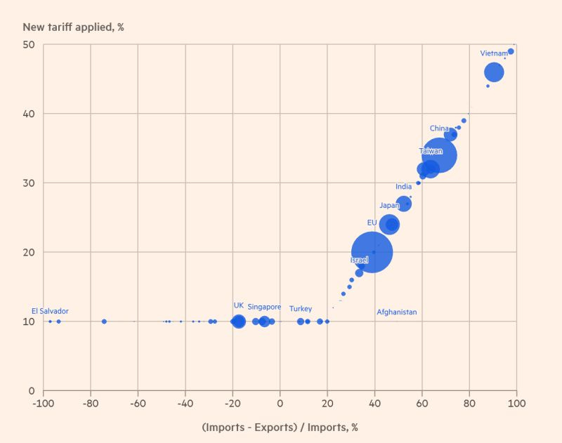I believe the important question in many investors’ minds was what caused the Trump administration to walk back the very oddly calculated tariffs. As a recap, initially announced tariffs were calculated by assuming that the US trade deficit with a given country as a percentage of imports was purely driven by tariffs, and imposing half of that quantity as the tariff measure. For countries with less than 10% trade deficit (or even surplus, if one existed) a convenient 10% tariff floor was applied. Financial Times has a nice chart showing the now reverse-engineered relationship, key chart is produced below.
